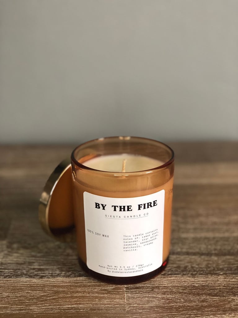 By the Fire embodies a warm, woody and sweet scent. It contains notes of lemon zest, lavender, star anise, jasmine, sandalwood, patchouli and vanilla.